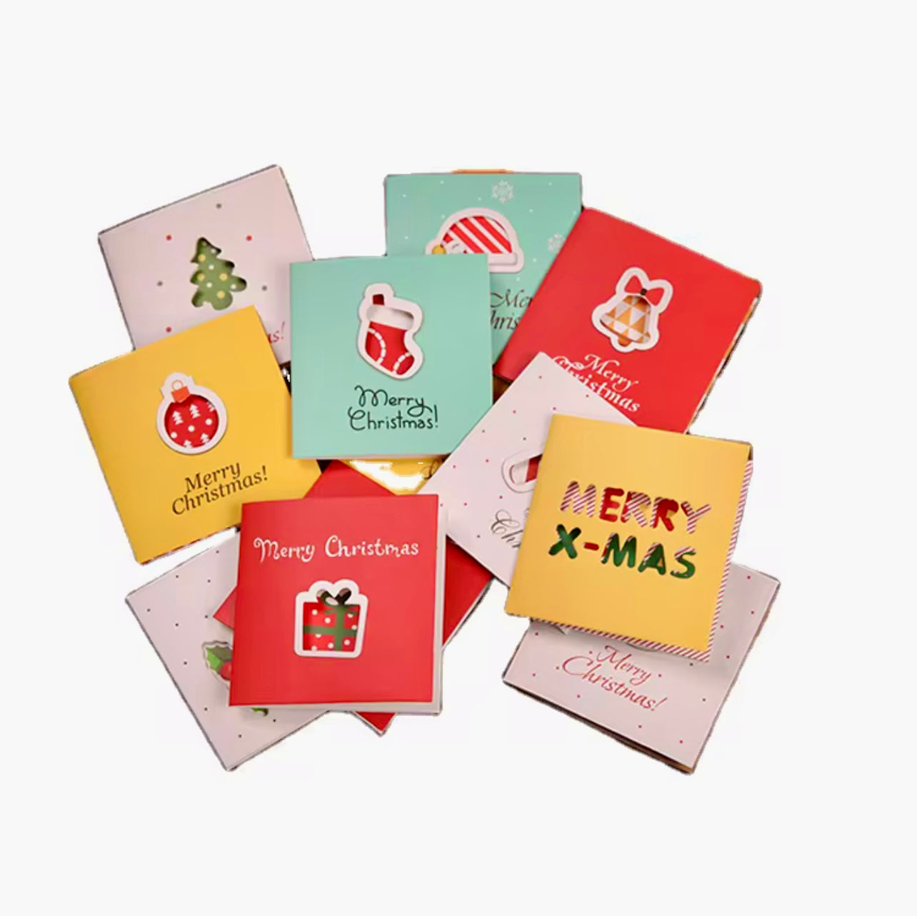 Includes: 12 mini Christmas cards in red, green, yellow, and white+ 12 envelope.